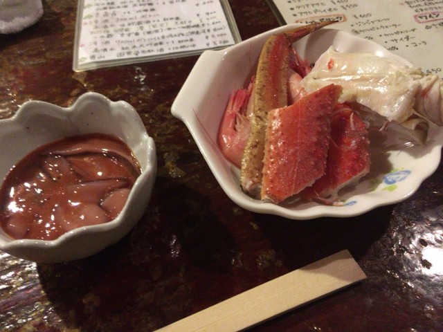 豪華880円のお通しはカニ、エビ、イカの塩辛、