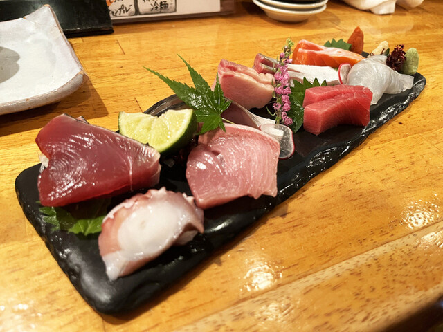 造り盛り合わせ(信州サーモン・ひらめ・しまアジ・鯨さえずり・赤身・サバきずし・三高ぶり・カツオ・茹で蛸)