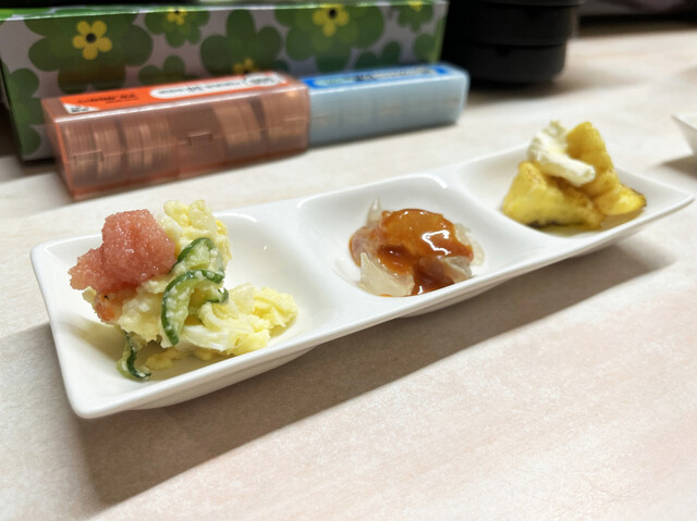 セット(アテ3品+ドリンク1杯/500円) この日のラインナップはね、魚の南蛮酢、たまご細巻き、たこキムチ♪