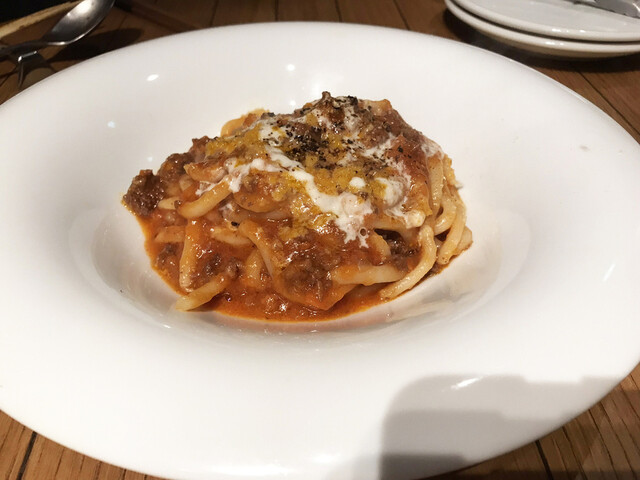 自家製ブカティーニ 牛肉のラグーソースとフォンドゥータ(1,500円)