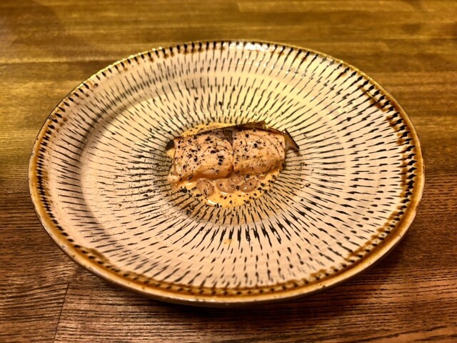サーモンは、醤油と魚醤で和えたものらしいんやけど、ええ感じに脂ののったサーモン、焼き茄子のソースとの相性抜群で美味しいのなんのって♡