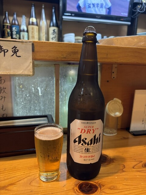 とりま瓶で乾杯して、カウンターの料理を確認!
