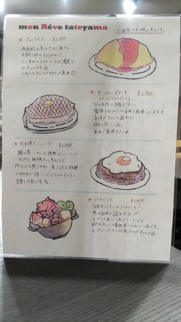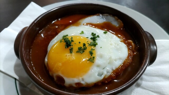 この日のメニューは、猪肉を使った料理が多かった印象でしたが、「目玉焼きハンバーグ(デミグラスソース) 税込1,350円」に、ライス&ミニサラダ(各200円)とデザート(300円)をつけました。