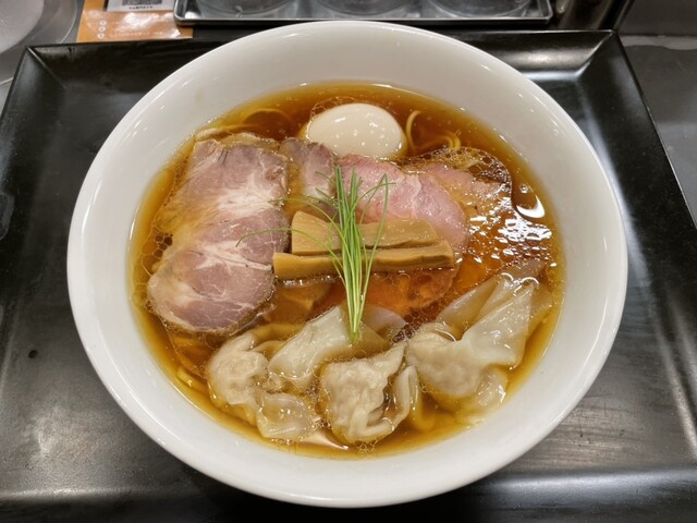 着席して5分ほどで鶏そばが運ばれてきました。以前の鶏そばよりスープが透き通っている印象です。琥珀色のスープに豚チャーシューと味玉、ワンタン、メンマが乗っています。
