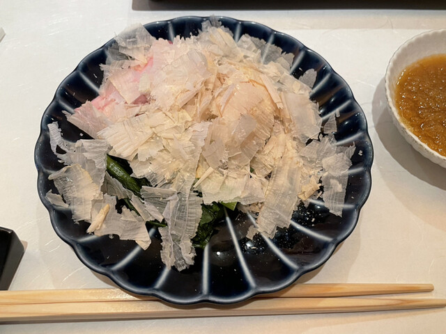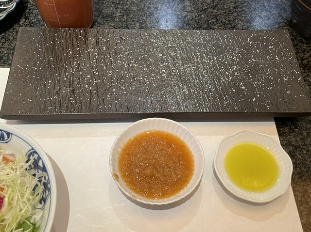 最初に野菜サラダと漬け物が運ばれてきました。野菜サラダは、千切りキャベツとレンコン、玉ねぎにトマトベースの特製ドレッシングをかけます。お漬物は浅漬けの上に鰹節がかけられています。薄味で食べやすいお漬物です。