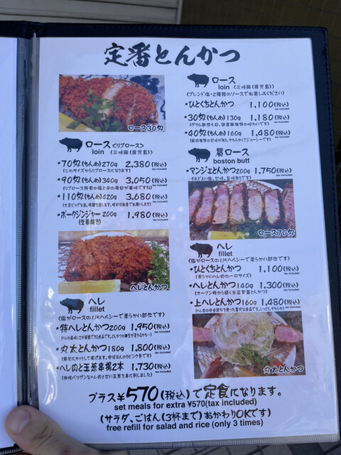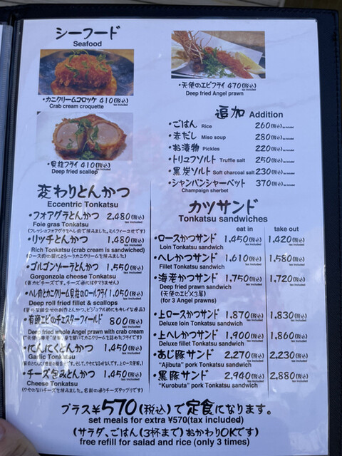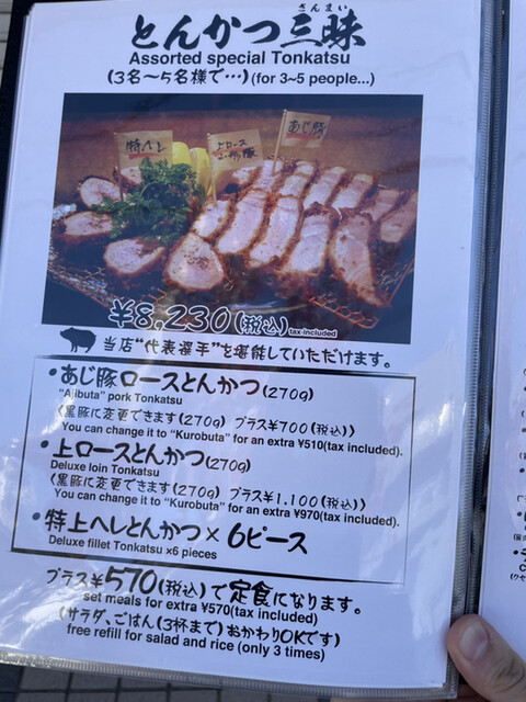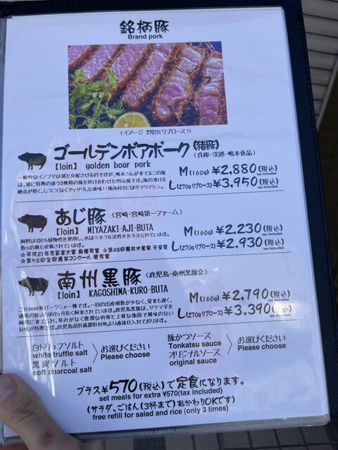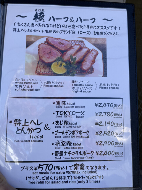 開店時間5分前に行くと、1巡目の客が並んでいました。ここでメニューを渡されます。数種類のブランド豚が提供されます。「至高のとんかつ盛合せ」という名前に惹かれて、氷室豚&特上ヘレとんかつのセットを注文しました。お塩は白トリュフ塩、ソースはオリジナルソースでお願いしました。