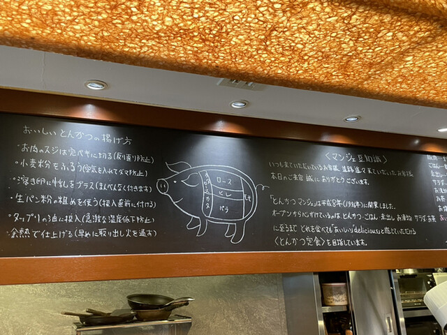 店内はカウンターのみ、店主さんが目の前でとんかつを揚げてくれます。大理石のようなテーブルで、高級感を感じます。とんかつを待つ間、ボードの豆知識を読むこともできます。