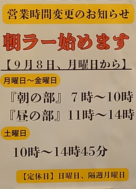 7時過ぎで先客3名。他店の朝ラーメンと違い、皆さんゆっくり食べていて、ここだけ朝の殺伐感がありません笑