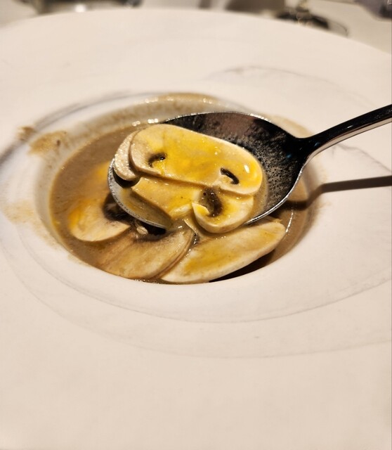 スペシャリテ。目の前でスープを注いでくれます。スープの中の半熟卵を崩して、たっぷりのマッシュルームといただきます。濃厚で美味しかった!
