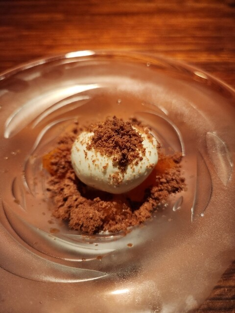 ポルト酒とバニラでコンポートした柿は見た目はトマトのよう。練乳のアイスとショコラのグラニテを添えて。