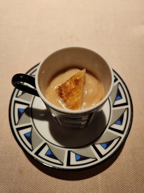 トリプルコンソメと昆布出汁を使ったロマネスコのスープ。塩を一切使わず、野菜だけの味わい。何でも美味しいのではなく、野菜の組み合わせも合う合わないがあるんだとか。