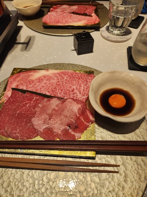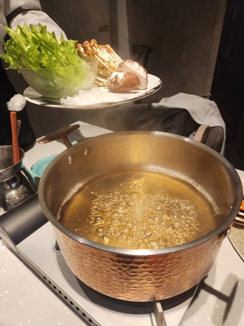 最初に提供された神戸牛の出汁しゃぶになります。サーロインは溶き卵で、タンとフィレは出汁でいただきました。とろけるサーロイン最高です。拘りのお野菜も美味しくて、出汁も一緒に飲んでいたら、あっという間に出汁がなくなってしまいます。飲み干したくなるくらい美味しい。