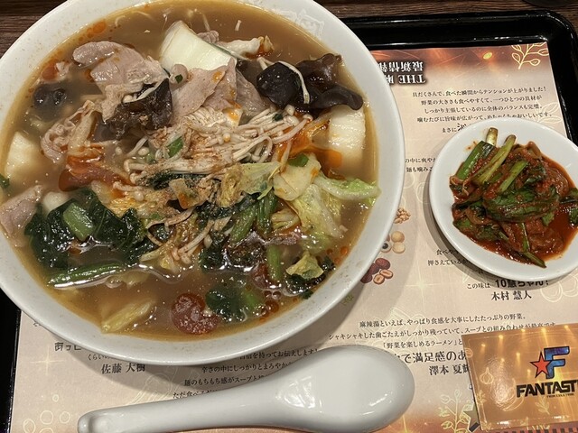 激辛好きの私としては色やメニュー名ほど辣さは感じませんでした。台湾風ともシンガポール風とも思うのは五香粉?ただただ激辛なら残らない不思議なスパイスが振ってあります。白菜は火を通し過ぎず、えのきは石突ギリギリでカットあえてほぐさず、コリコリのキクラゲと合間って食感のコラボをしています。