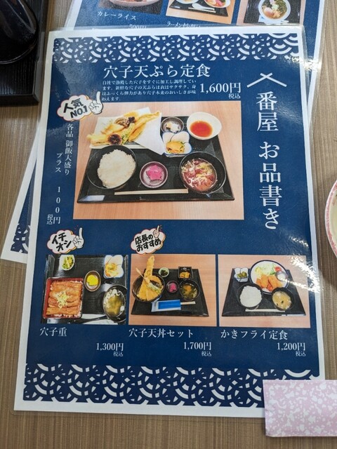 食堂では穴子中心のメニューで、迷わず穴子天ぷらを注文しました。お水とかはセルフになります。