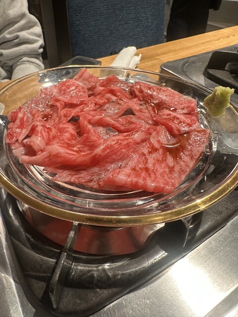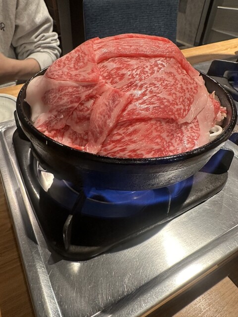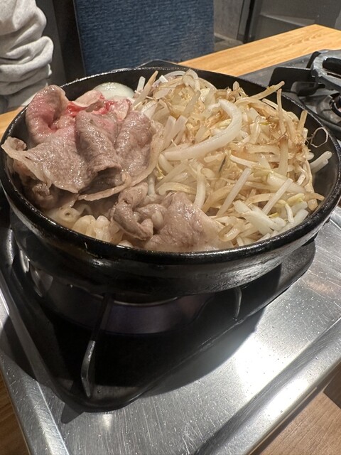特上肉鍋。この量で1人前です。お肉の下に2種類のもやしと玉ねぎが隠れていて、甘辛いタレですき焼き風ですが、すき焼きよりあっさりしてて美味しい。