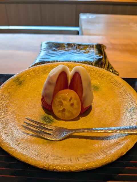 練乳と白餡で苺のおはぎに金柑の蜜煮添え