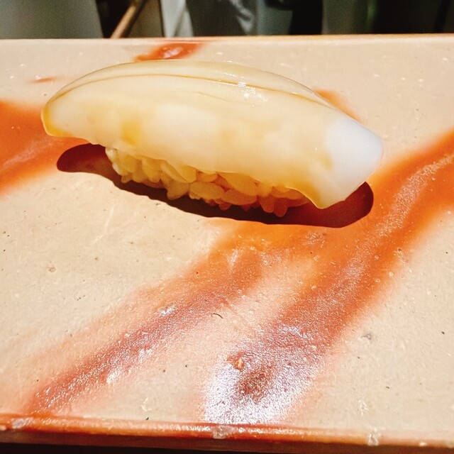 冷たい温度感で提供されるコハダ。普段はコハダがそんなに好みではないですが、このコハダの温度感は工夫されていて、シャキッとしたシャープな味わいで、酸味が強いわけではないけどピシッと酸が立っていて、とても美味でした。