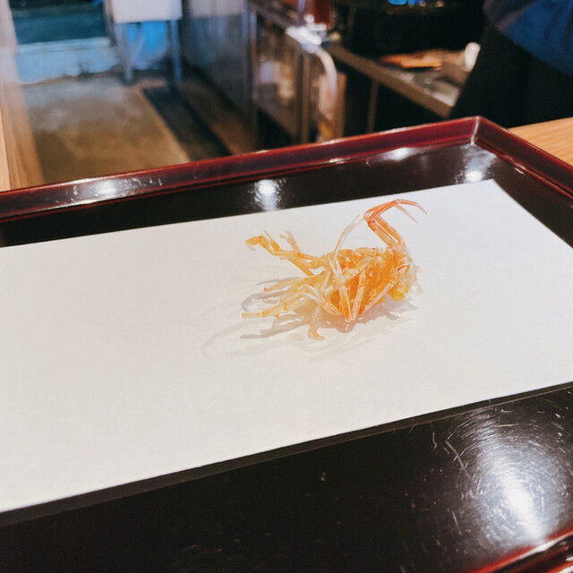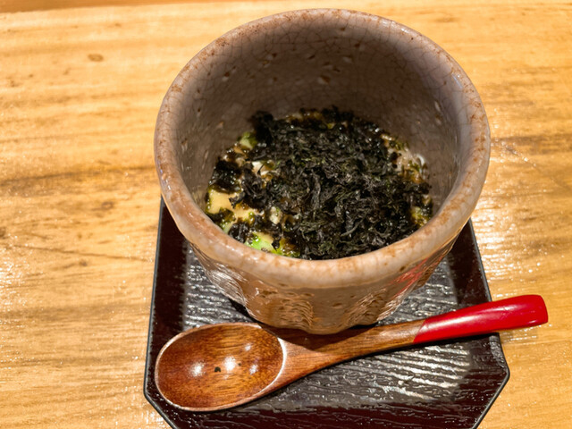 今回のコースでは一品料理の最後の一品に。出汁の旨味と蟹の旨味、天草海苔の香りが心地よいですね。