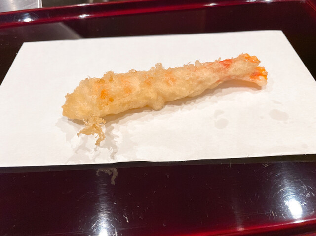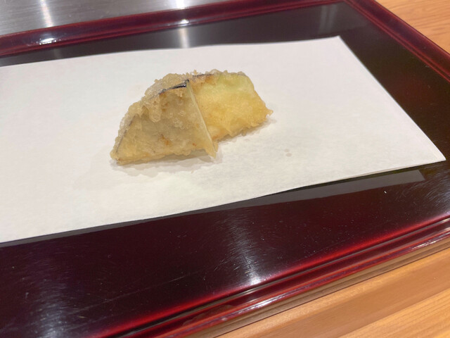 天ぷらの再開の初めは茄子。この茄子がとろとろ炒めナスといった熊本のブランドで、名前が一回聞くと忘れないインパクトがあります笑 普通のナスの形状と違って、球体に近い形状で、見た目もインパクトが大きかったです笑 名に違わない、ナスの美味しいトロっとした身の感じがありました。