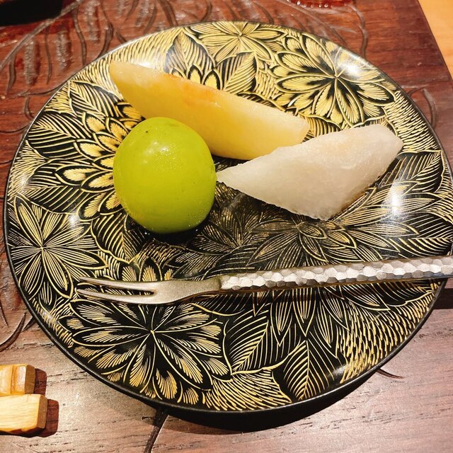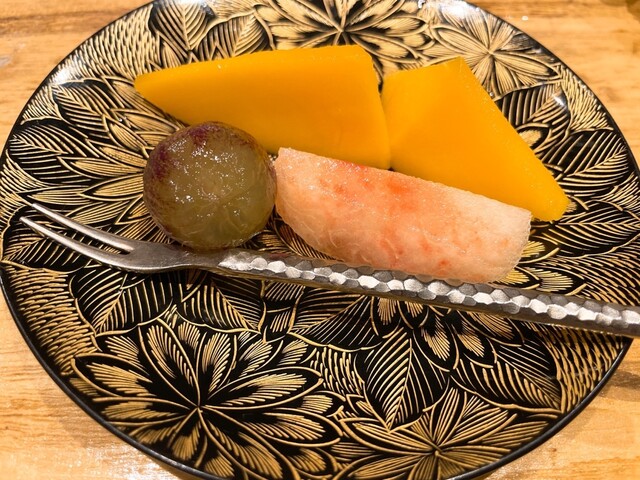 今回の鮨はコハダ、カマスの昆布締めの2貫でした。たけうちさんの鮨はこれまた一品メニューの中でも印象的なコーナーですが、今回は特にカマスの上品な旨味と脂感に感動でした。シャリの硬さも個人的に好みです。