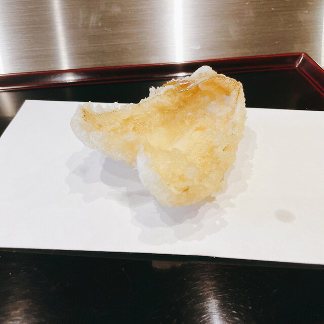 1つ目がいつもの海老の頭、そして今回は新銀杏も合わせてでした。パリパリっとした海老頭の食感に、新銀杏の柔らかい食感が対をなしてます。新銀杏は天ぷらにすることでより一層実の柔らかさが引き立ちますね。