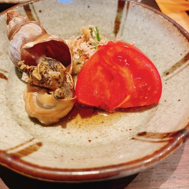 箸休めにはつぶ貝と南関あげとトマト。このつぶ貝もしっかり美味しいです。