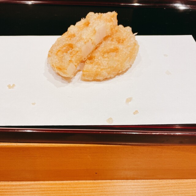 今回の貝類はホタテ。衣はサクッと、身はレアに仕上げてあるのが絶妙な揚げ加減です。このレア感はまるでステーキのようで、食材の美味しさをダイレクトに感じます。