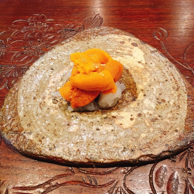 エゾバフンウニらしいコクと味わいにヤリイカの繊細な甘みがマッチします。まぶしてある塩も良い塩梅です。