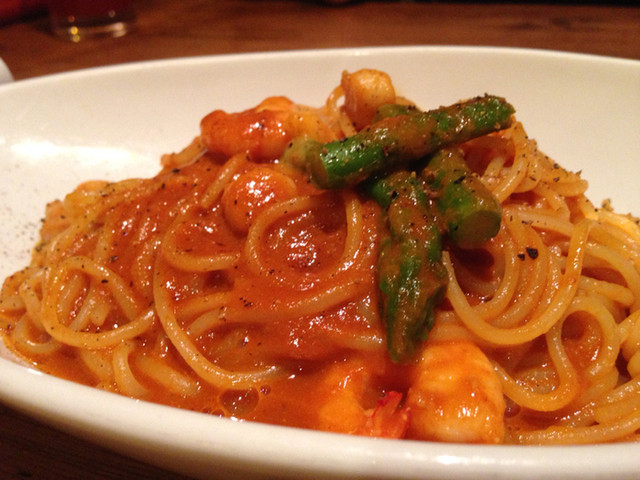 海老と貝柱、アスパラの自家製アメリケーヌソース