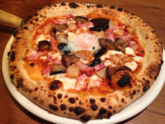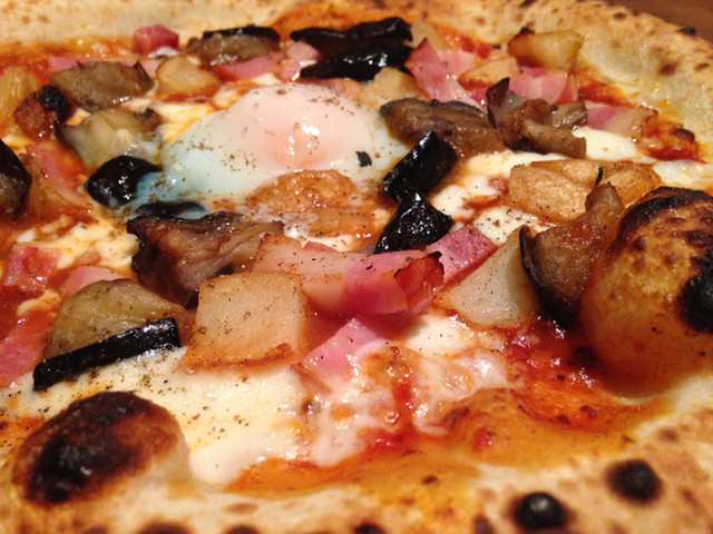 ベーコンと揚げなす、温泉玉子のミートソースピッツァ