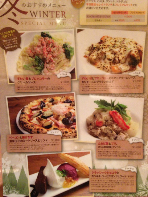 〜2014年12月18日(木)〜地元で、以前から車で通っていて気になっていたお店。調べたら、他にも店舗があるみたい。思っていたより良かった♪席は、オープンエリアと半個室があって、雰囲気良し。3,680円(1,840円/人)のプレミアムセットにした。+200円でプレミアムドリンクバー付けて。ドリンクバーは、プレミアムっていうだけ、種類は沢山あって、プレミアムセットを頼まない人は通常400円するみたい。フレッシュジュースらしいドリンクが数種、紅茶や、ジャスミンティーとか、スープもあった。あたしは、最初にマンゴージュース、寒かったからすぐにホットのジャスミンティー、食後のデザートでアールグレイ飲んだ。ジャスミンティーが気に入った。シェフの本日のおすすめサラダコブサラダ?のようなドレッシングっていうのかな、チーズせんべいみたいなのと、スモークサーモン?も入っていて美味しかった。けっこう好みのサラダだった。ハーブフライドチキンソースが4種から選べて、たまり醤油&チーズソースにした。ソースつけなくても美味しかったと思うけど、けっこうチーズが濃厚なソースだった。ベーコンと揚げなす、温泉玉子のミートソースピッツァ追加100円で冬季限定のやつから選んだ。生地がもちもちでフォカッチャみたいな?感じ、いけた。具沢山で他にじゃがいもがトッピングされていた。海老と貝柱、アスパラの自家製アメリケーヌソースこれも追加200円。思っていたより、美味しかった!これ正解!パスタももちもちして美味しかった。追加200円出しても満足のいく美味しさだった。この、アメリケーヌソースって好き。シェフのスペシャルドルチェ盛り合わせこちらは1人ずつ。バニラアイスがしっかり冷えていて融けにくくてGOOD‼大体この手のやつって、出された時点でちょっと融けていたり、写真撮っている間に融けちゃったりするけど、大丈夫だった!しかもボリュームあって、好みのバニラアイスだった。ケーキの方は、キャラメル系だった。ナッツが入っていて好きなやつで良かった。生クリームは多いんだが。この日凄く寒くて、お店入ってからもずっと寒かったので、着ていたダウンを膝にかけていたんだけど、デザートのときに、気の利く店員さんがひざ掛けを持って来てくれた。最初に寒かったから聞こうと思ったけど、無いだろうと思って聞かなくって、デザート時点で気付くのも遅いなぁと思うけども、思いがけなかったら嬉しかった。前から行きたかったお店に行けて良かった。しかも想像していたより、雰囲気も良くて美味しかったし、また行きたい。PISOLA寝屋川堀溝店大阪府寝屋川市堀溝2-267-1072-813-5590