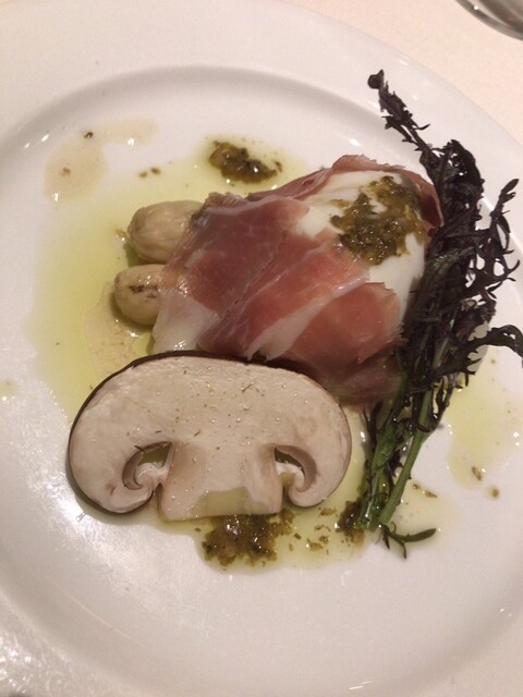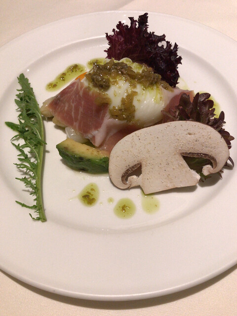 冷菜:ホワイトアスパラと山形紅花卵のポーチドエッグ ニセコの赤石さんの生ハム添え