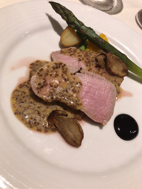 関東での呼び名は尾長鯛ですが、沖縄ではアカマチと呼ぶ沖縄三大高級魚の一つです(あとの二つはアカジンとマクブ)。鮮魚のポワレは、通常は青海苔ソースなのですが、主菜とクリーム系のソースが被ってしまうので、今回はお任せでお願いしました。天然ナメコとキクラゲの入ったブイヤベースは、フュメドポワソン、フュメドコキーユが濃厚なとろみのあるスープ。その上に皮目をパリッと焼いた尾長鯛を乗せていて、かなり贅沢な一皿になりました。