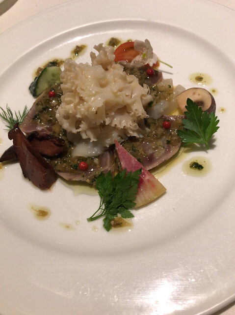 前菜1:藤本氏のブリのカルパッチョ ハナビラタケ添え 京都実山椒ドレッシング