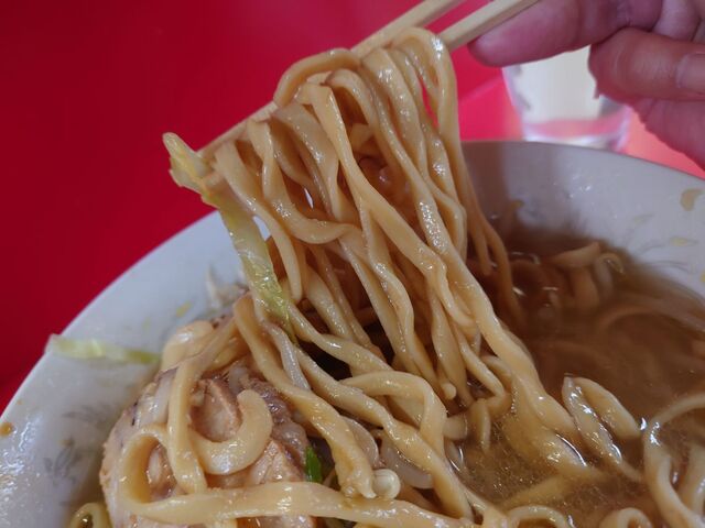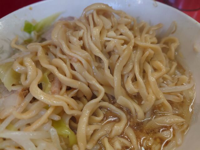 麺は相変わらずの小麦感バリバリの極太縮れ。