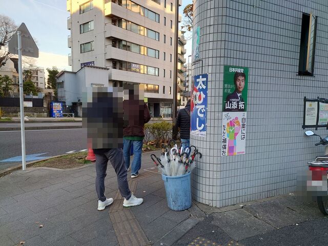 オヤッさんは、お客さんが使った回収用のポリバケツに溜まった日傘を元のバケツに