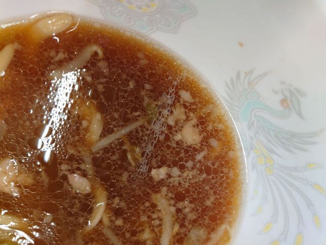 スープ表面には透明なアブラの層があり、その下は濃厚そうな茶褐色スープ!