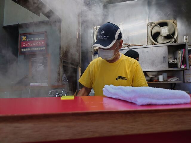 外から店内を覗いてみると麺上げはジュニアさんに神田神保町のデカい助手さんの二人体制。