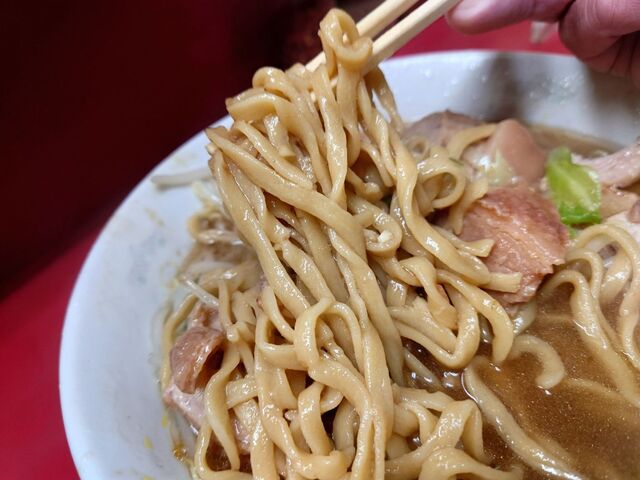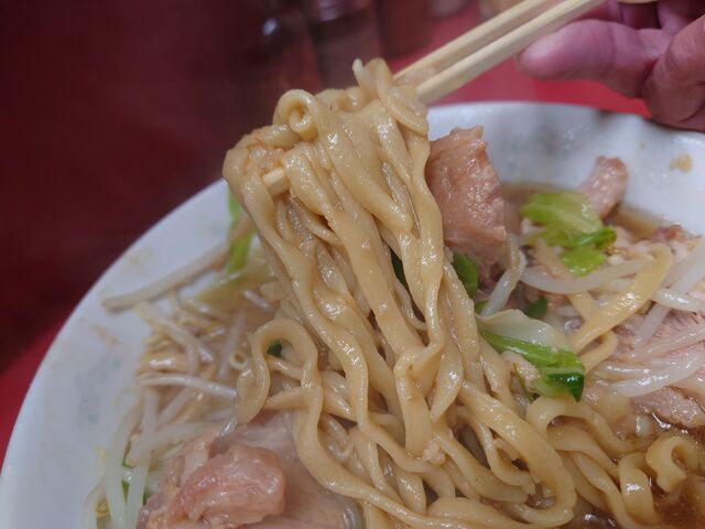 麺は、小麦の風味が感じられる二郎にしては若干細めの極太縮れ麺。