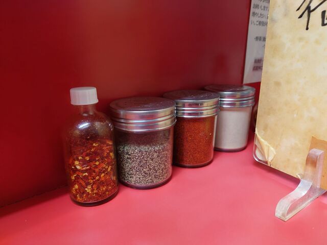 卓上には鷹の爪、コショウ、七味唐辛子が常備。