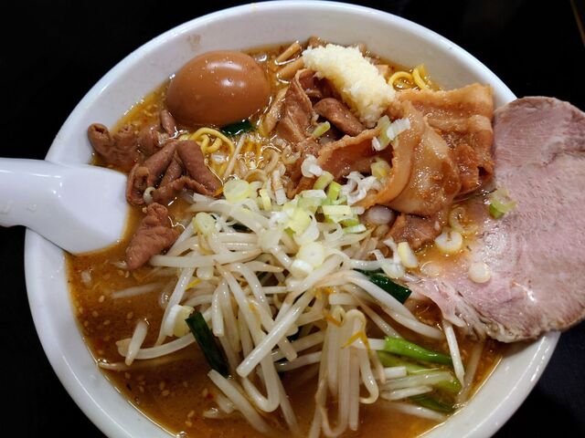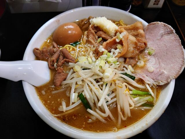 久しぶりの味噌でモヤシ炒めにニラとモツ煮込みをミックスした具材をトッピングとのこと。