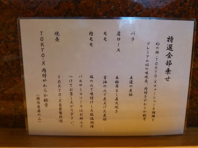 チャーシューは、幻の豚Tokyo-x銘柄豚を使用。通常の豚より旨味や栄養素ビタミンの含有量が高いとの事。