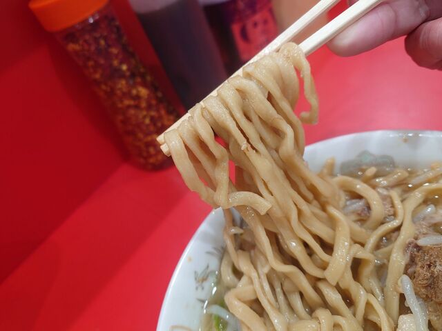 二郎標準位の極太で所々にウネリがかった平打ちの小麦の香りと旨味がサイコーの麺。