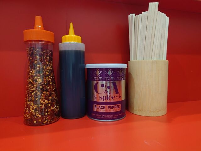 そして、卓上にはブラペと唐辛子が常備。給水機横にはBOXティッシュもあります。