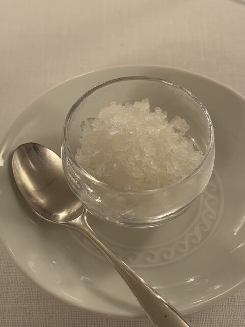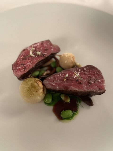 お口直しがあり、メインです。お肉料理3種の中から選べますが、プラス料金なんて何のその。せっかくなのであか牛のわら焼きを選びます。熊本あか牛の藁焼きってイタリアンのメインでよく目にしますが、イタリアンのコースのラストにピッタリって感じなのでしょうか?ソースの味、焼き加減、香り、全てが絶妙でラストに相応しい料理でした。