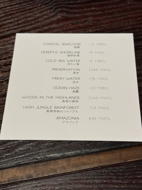 その後席について本日のメニューの説明がありますが、ペルーの地形をイメージしたメニューになっています。水深や海抜何mくらいの位置の食材を使い、その調理法、調理道具、生態系、風景などを感じ、知ってもらう。これは面白い発想です。例えば、冷たい海水 海抜5mとかだと、何となく貝料理でも出てくるのかな?って予想すると当たったりします。9つのペルーの生態系を感じながら、旅をしているかのように食事を楽しむそうです。