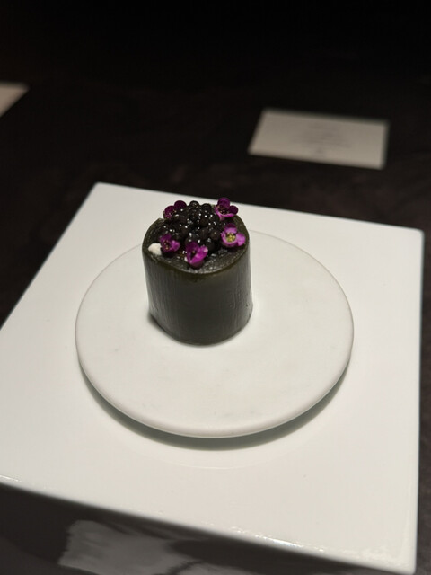 2品目は昆布巻き。モッツァレラチーズ、能登ころ柿が巻かれ、上にはキャビア。こちらも一口で。