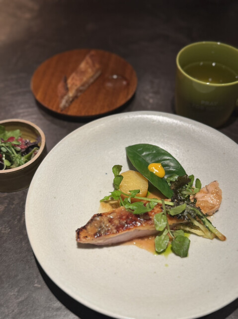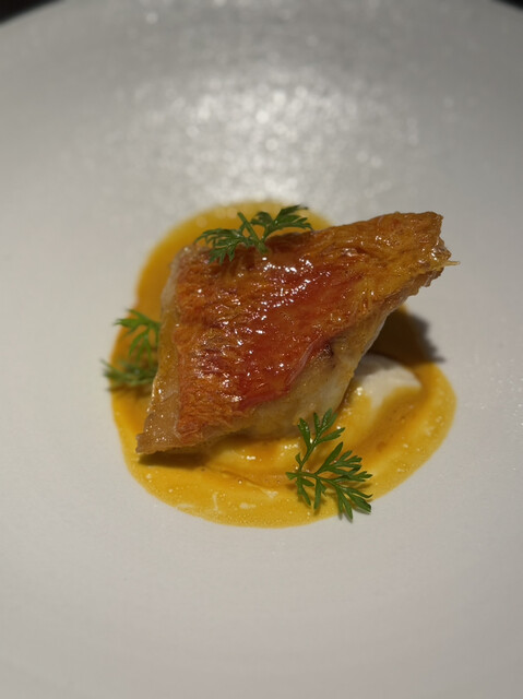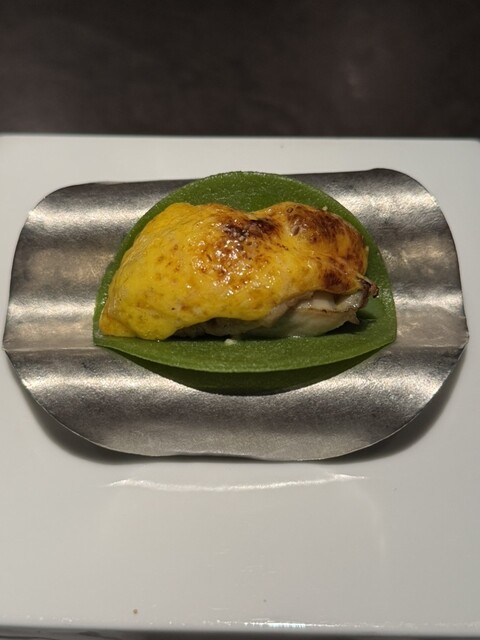 石川県出身で能登の食材や名産物が多く使われています。輪島塗のお椀で出てきた梅昆布茶。魚の骨の出汁に、昆布、梅干しが入ります。身体に染みる一品。一口メニューが続きます。ポテト・スパイスは、蒸して低温で揚げたポテトチップス的な。トリュフバターと、スパイスが絶妙で、これまた美味い。続いて、タロ芋の点心は、バナナのロースト、ナツメグでスパイスを効かせ、イベリコ豚の生ハムをのせて。うまい。そして、牡蠣、毛蟹のグラタン風クレープ包み。最高ですね。