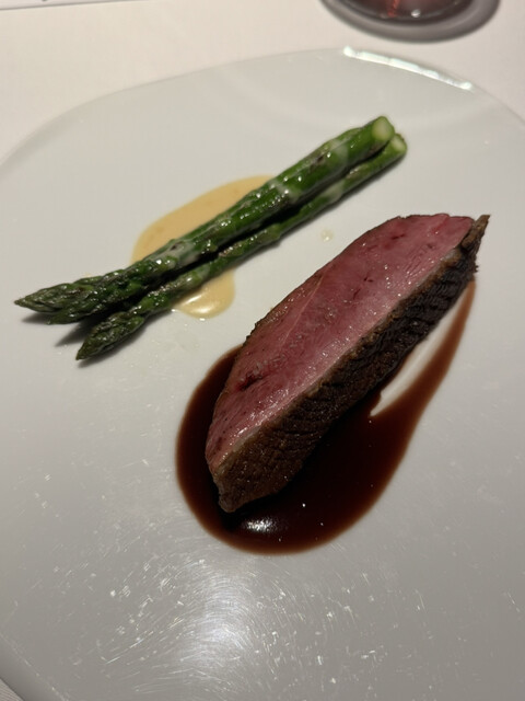 鮎のフリットは七輪で仕上げをし、ソースをかけてフワサクでいただきます。メインの鴨胸肉もまったくクセもなく最高です。ラビオリで〆てあとはチーズ、デザート、焼き菓子で終了。