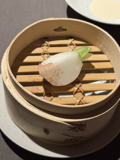 クラゲは海月と書きますが、海蜇とも書けるようです。すだちをくり抜き、中にクラゲがたくさん入っています。浙江省のキャビアが敷き詰められていて塩味、酸味ともにバランス良く出来ています。